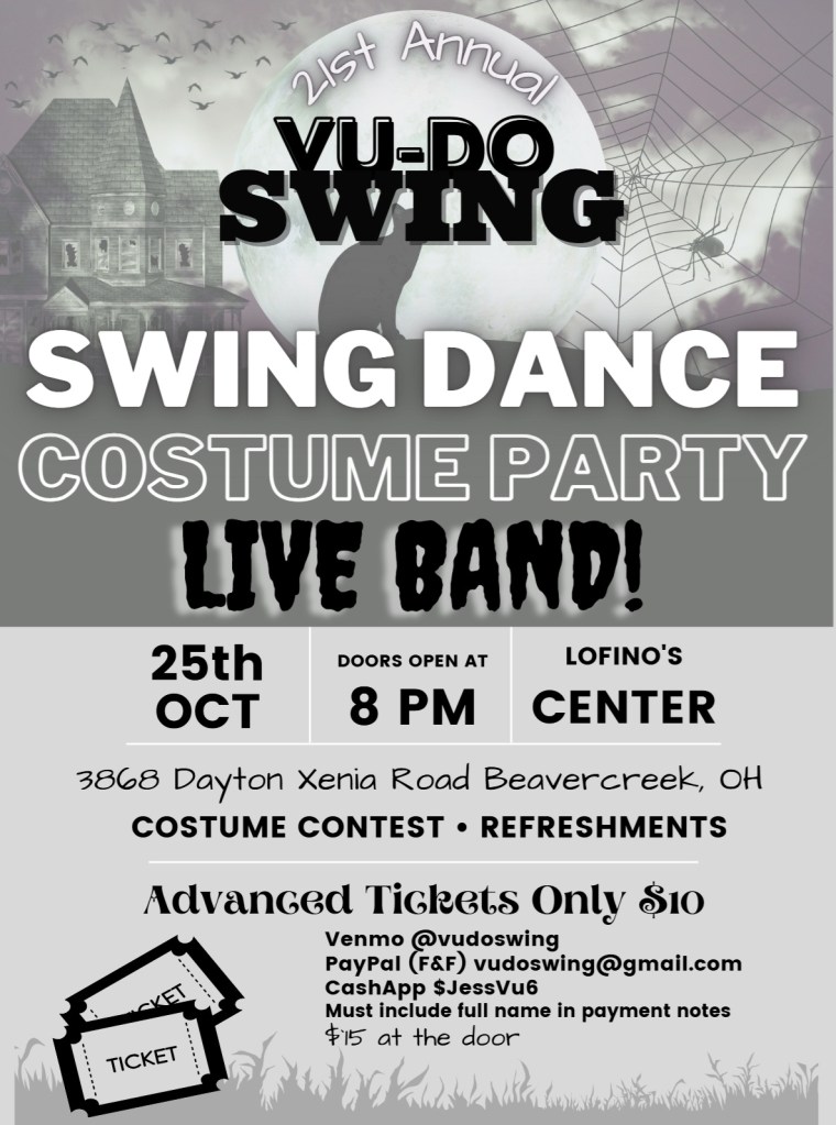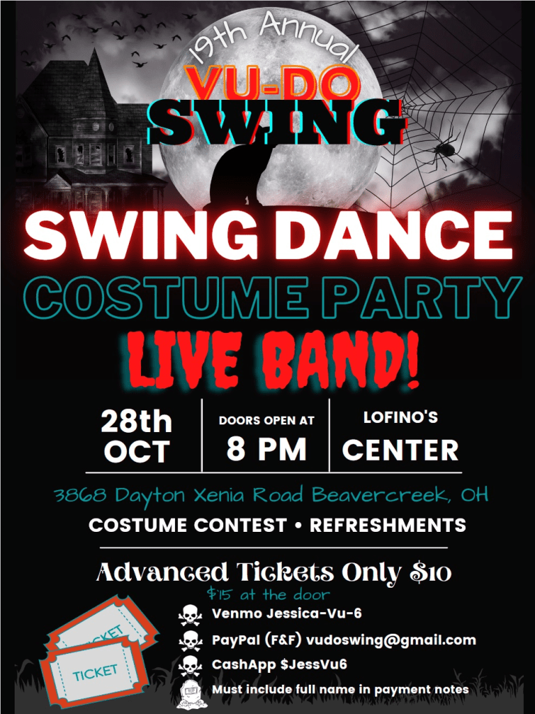 August 29, 2026 at C.I. Beaver Hall 3696 Highmont St. Beavercreek. Doors open at 8pm. Beginner’s lesson with entry fee 8:15pm. Open dancing 8:30-10:30. Five dollars per person (cash or Venmo at the door). Water and refreshments included. Easy, well-lit parking. All ages welcomed.